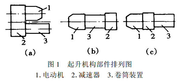 電動(dòng)葫蘆的起升機(jī)構(gòu)主要有:起升用錐形轉(zhuǎn)子制動(dòng)電機(jī)、卷筒裝置、減速器和吊鉤裝置4個(gè)動(dòng)力和傳動(dòng)部件。電機(jī)、減速器和卷筒裝置3個(gè)部件的排列有平行軸(a)和同軸兩種排列方式,同軸式有分有(b)和(c)兩種排列,見(jiàn)圖1。