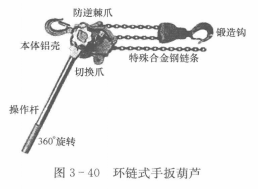 1、環(huán)鏈?zhǔn)绞职夂J(見(jiàn)圖3-40)。靠扳動(dòng)手柄,通過(guò)傳動(dòng)機(jī)構(gòu)帶動(dòng)起重鏈條升降重物。環(huán)鏈?zhǔn)绞植话埠J是設(shè)備安裝,貨物起吊、物體固定、綁扎和牽引的理想工具,尤其是任意角度的牽引和在場(chǎng)地狹小,露天作業(yè)及無(wú)電源的情況下,更顯示其優(yōu)越性。