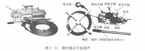 2、鋼絲繩式手扳葫蘆。鋼絲繩式手扳葫蘆(見(jiàn)圖3-41),又稱橫向牽引機(jī),它不但能作一般牽引、卷?yè)P(yáng)、起重工作。而且還能在傾斜高低不平的狹窄地帶和曲折轉(zhuǎn)彎的條件下進(jìn)行工作。