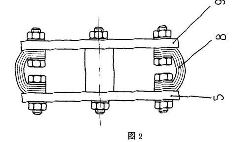 該電動葫蘆采用獨(dú)特的設(shè)計(jì),利用手拉葫蘆和煤電鉆相結(jié)合,其手拉葫蘆的手拉轉(zhuǎn)輪上沒有纏繞搭接手拉鏈,煤電鉆包括機(jī)殼和卡裝在煤 電鉆的卡具上的鉆桿,手拉轉(zhuǎn)輪與鉆桿同軸設(shè)置,手拉轉(zhuǎn)輪朝外的端面朝向煤電鉆,殼體和機(jī)殼采用固定架固定相連,手拉轉(zhuǎn)輪朝外的端面上固定有手拉轉(zhuǎn)輪法蘭盤,手拉轉(zhuǎn)輪法蘭盤上均布有多個(gè)螺栓孔,每個(gè)螺栓孔處采用緊固件分別與一個(gè)皮帶條的一端固定相連,每個(gè)皮帶條的另一端通過鉆桿法蘭盤上的螺栓孔采用緊固件連接固定在鉆桿法蘭盤上,鉆桿法蘭盤上的螺栓孔位置與手拉轉(zhuǎn)輪法蘭盤上的螺栓孔位置對應(yīng),鉆桿法蘭盤安裝固定在鉆桿的端頭上。在使用時(shí),當(dāng)需要起吊重物時(shí),可利用煤電鉆的電機(jī)帶動鉆桿按照需要的方向旋轉(zhuǎn),鉆桿就會通過鉆桿法蘭盤、多個(gè)皮帶條8和手拉轉(zhuǎn)輪法蘭盤帶動手拉葫蘆的手拉轉(zhuǎn)輪按照需要的方向轉(zhuǎn)動,從而完成對重物的起吊。由于采用皮帶條這種軟連接設(shè)計(jì)將煤電鉆的電機(jī)產(chǎn)生的扭矩傳遞到手拉葫蘆的手拉轉(zhuǎn)輪,保證了手拉葫蘆轉(zhuǎn)動的平穩(wěn)性,再由于煤電鉆的輸出轉(zhuǎn)速較低,不需要另加減速裝置,故本發(fā)明的利用手拉葫蘆和煤電鉆改造成的電動葫蘆的結(jié)構(gòu)非常緊湊,體積也較小,尤其適宜井下機(jī)電硐室起吊、裝卸設(shè)備和物件、以及安撤面使用,并可降低工人勞動強(qiáng)度,提高工作效率。