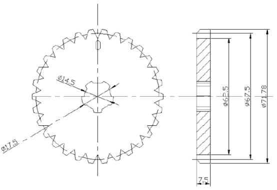 根據(jù)葫蘆傳動(dòng)齒輪低速重載,根據(jù)手拉葫蘆傳動(dòng)結(jié)構(gòu)的原理由五尺長(zhǎng)軸的小齒輪帶動(dòng)片齒輪甲、乙,考慮到五尺長(zhǎng)軸的小齒輪齒數(shù)甚小等特點(diǎn),1.5型葫蘆選用了齒形角20°的漸開(kāi)線特種片齒輪變位齒輪,其基本齒形的基本參數(shù)如圖所示。選用齒形是考慮了以下因素:1.5t葫蘆傳動(dòng)齒輪的小齒輪齒數(shù)甚少為了避免根切和增強(qiáng)度,只能用正變位切削這樣小齒輪的外圓就受齒條的正切力,片齒輪與短軸屬于過(guò)硬配合,片齒輪的中心要設(shè)計(jì)出與短軸尺寸屬于硬配合的小花鍵孔尺寸如圖所示: