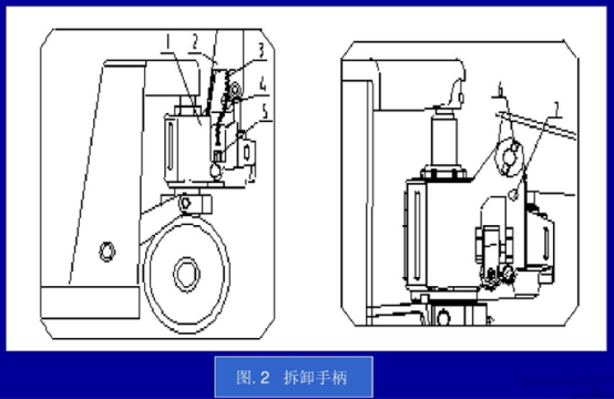 完全拆卸手柄:手柄的拆除方法如圖2:將鏈條3的端部從杠桿板5的槽內取出來。把鏈條3從軸4的中間孔內抽出來。將手柄扳約80°,往孔7內插入螺絲刀。用工具榔頭和沖頭拆下彈性銷6,并把軸4拆下來,然后取下手柄。
