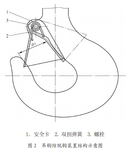 吊鉤防脫鉤裝置:該吊鉤防脫鉤裝置為卡片式結(jié)構(gòu),該裝置由安全卡、雙扭彈簧、螺栓組成,如圖2所示。經(jīng)現(xiàn)場(chǎng)檢查,事發(fā)后安全卡處于吊鉤開(kāi)口以外非正常工作位置。安全卡長(zhǎng)110mm,款39mm,安全卡無(wú)明顯變形,雙扭彈簧功能有效,螺栓緊固完好。通過(guò)將安全卡恢復(fù)到正常工作位置后手動(dòng)測(cè)試,安全卡動(dòng)作復(fù)位靈活,防脫鉤裝置具備正常防脫鉤功能。