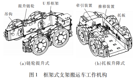 框架式支架搬運車主要用來拖運支架,如圖1所示,其工作機構是基于U形框架的鏈輪提升式(或托板升降式)支架裝載機構。鏈輪提升式機構是利用4 個吊鉤鉤住支架起吊環,通過操作提升鏈輪動作實現支架的提升裝載。倘若U形框架內寬設計較窄,待支架進入框架時,支架兩側剩余空間較小,增加了工人的掛鉤難度,影響了支架的裝卸速度;另外,倘若提升鏈輪的離地高度設計較高,待支架進入框架時,壞損支架的側護板處于張開狀態,張開的側護板極易與提升鏈輪發生碰撞,阻礙支架進入框架,同樣影響了支架的裝載速度。托板升降式機構的裝卸架原理是在裝架時落下托板,利用牽引裝置將支架牽引至框架內,卸架時利用推移裝置將支架推出框架,以此實現支架的裝卸。倘若在使用過程中,托板滾輪卡滯,加之牽引裝置繩力設計有限,則會導致裝架困難;倘若推移裝置推出時,其導向套筒發生變形別卡,則會導致卸架困難,進而影響了支架搬運車的作業效率。