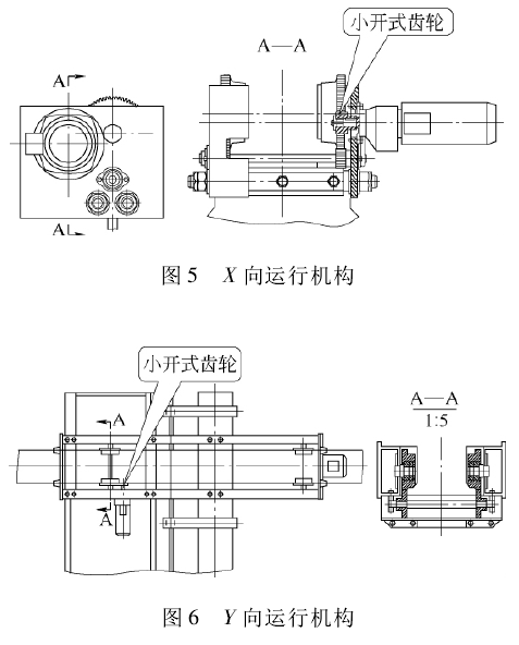 X、Y運行機構采用H型鋼運行軌道,為解決輪壓分布不均勻,易打滑的現象,車輪采用小開式齒輪—+同步開式齒輪裝置傳動的形式,運行機構采用三合一減速電動機,結構簡單,運行平穩,安全可靠。X、Y運行機構見圖5和圖6。