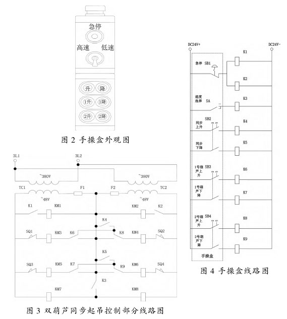 針對環鏈電動葫蘆的手電門控制和變頻器控制的缺點,在不改變兩臺獨立電動葫蘆機械結構的情況下可利用改造手電門電路的方式控制兩臺環鏈電動葫蘆,用以實現雙吊點同步起吊工作,即用一個手操盒控制兩臺葫蘆同步完成上升或下降動作。 對兩臺電動葫蘆的控制進行改造,手操盒以及部分電路圖見圖 2—圖 4。