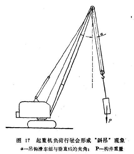 因為起重機負衙行駛時,由于道路不平或慣性原因,構件總難免要發生擺動而使起重機吊鉤滑車組離開垂直線位置,形成“斜吊”,如圖17所示。如果起重機吊著重量為P的構件已是滿負荷。則當梅件擺動后,實際就是格負荷了。構件擺動的夾角a如過大,傾覆力矩增大,起重機就可能翻車。因此,起重機滿負荷時要盡量避免行駛。如需作短距離行駛,只熊將構件吊離地面20—30厘米,且要慢行,還必須拉好溜繩,控制構件擺動。更多問題解答關注凌鷹電動葫蘆專業廠家。